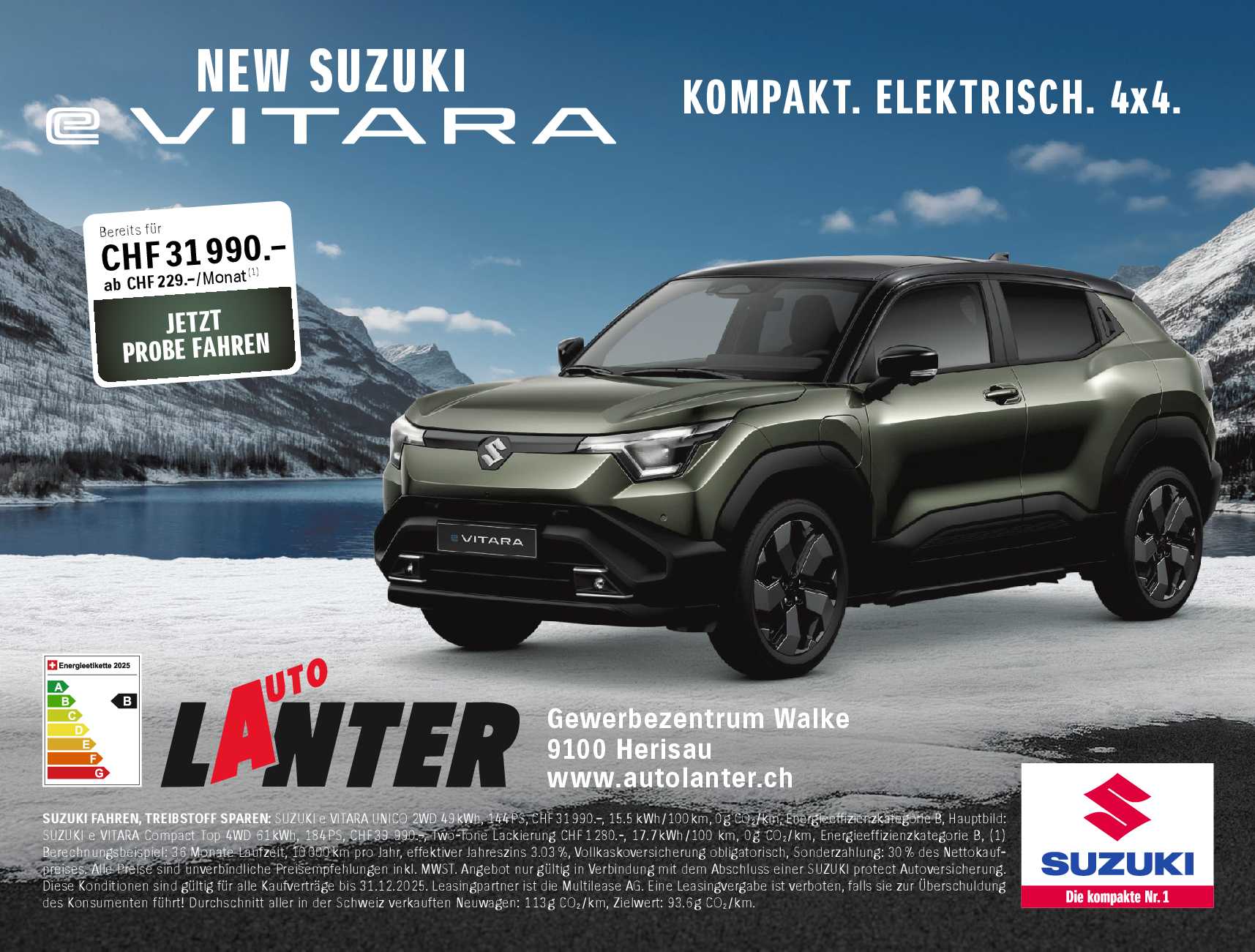 Mit elektrischen Antrieben bieten sich auch in Sachen Allradantrieb ganz neue Möglichkeiten. Beim neuen eVitara von Suzuki ist natürlich, wie auch bei den Verbrennerversionen, ein 4×4 zu haben. Dieser setzt aber nicht auf eine mechanische Kraftverteilung, sondern auf zusätzliche Kraft: Wie bei den meisten elektrischen Allradsystemen kommen hier zwei E-Motoren zum Einsatz – einer pro Achse. So können sich die beiden Achsen unabhängig voneinander um Vortrieb kümmern, es besteht also keine Gefahr von Verspannungen im Antriebsstrang.
