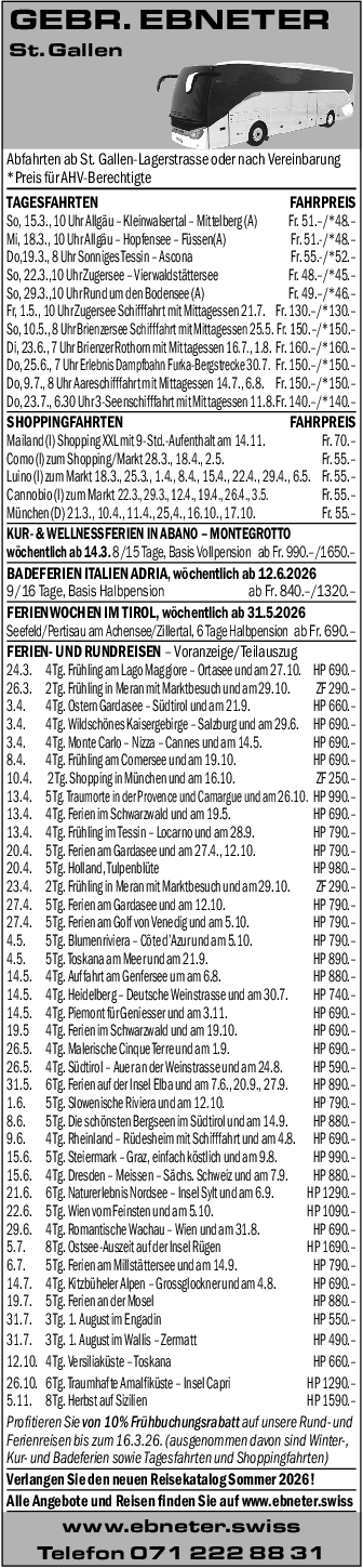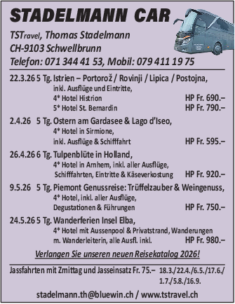 Pauschalpreis p. P. im DZ CHF 690.-, EZZ. CHF 150.-